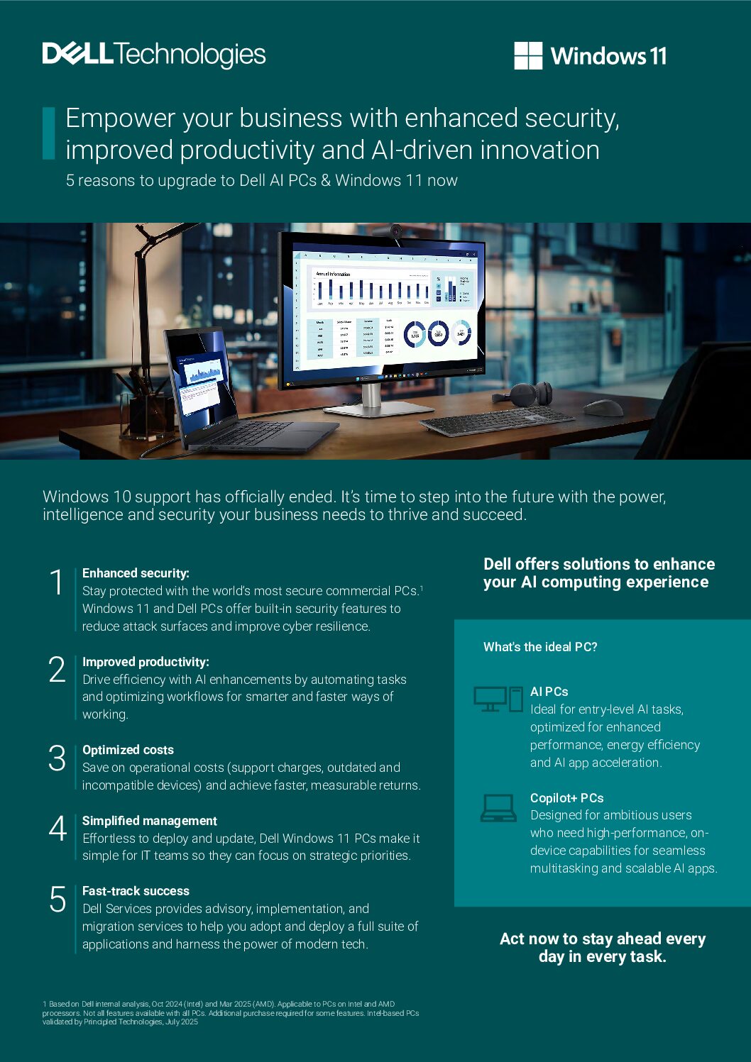 This one-pager breaks down the top five reasons to move beyond Windows 10 and embrace the future with modern AI-powered and Copilot+ PCs. From enhanced security and productivity to reduced costs, simplified management, and future-ready performance, each reason is paired with clear benefits and business impact. Whether you’re looking to boost efficiency or stay competitive, this quick guide shows how Dell and AI PCs can help you lead the way.